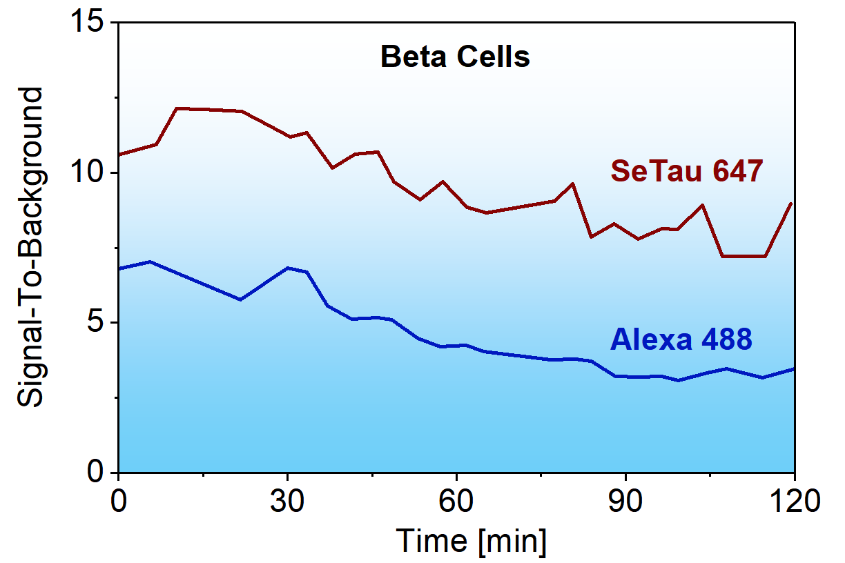 The group of Prof. Weissleder at the Harvard Medical School has synthesized, characterized, and tested three compatible imaging probes based on GLP1R targeting peptides to visualize pancreatic beta cells by intravital microscopy. Of the three conjugates (Alexa-488, Alexa-568, and SeTau-647) presented in their investigation, the performance of squaraine rotaxane dye SeTau 647 (K9-4148) was by far the best in this series. They determined that SeTau-647 had the highest signal-to-background ratio and the best in vivo imaging properties (2-photon as well as conventional)."Here, we present the first generation of two-photon beta cell-specific in vivo imaging probes based on GLP1R targeting peptides. Among the three compounds of potential interest, we found quite unexpectedly that a squarine-rotaxane conjugate (2PEx-SeTau-647) had near ideal in vivo imaging characteristics".