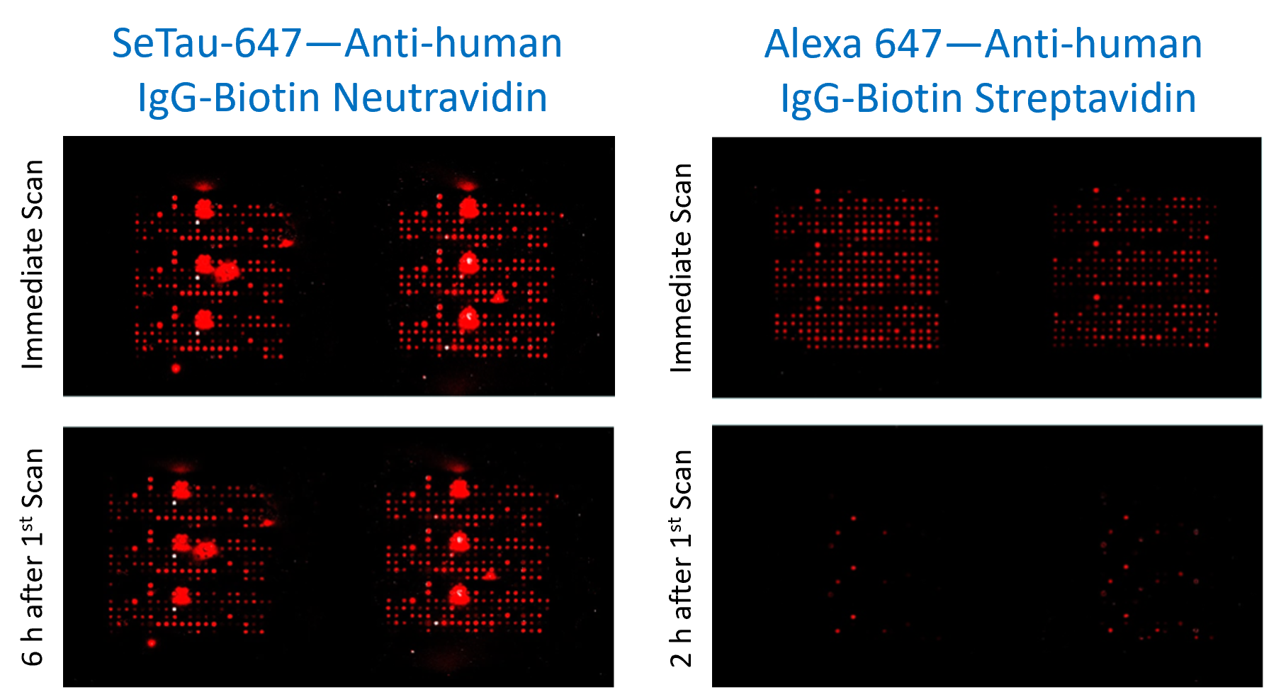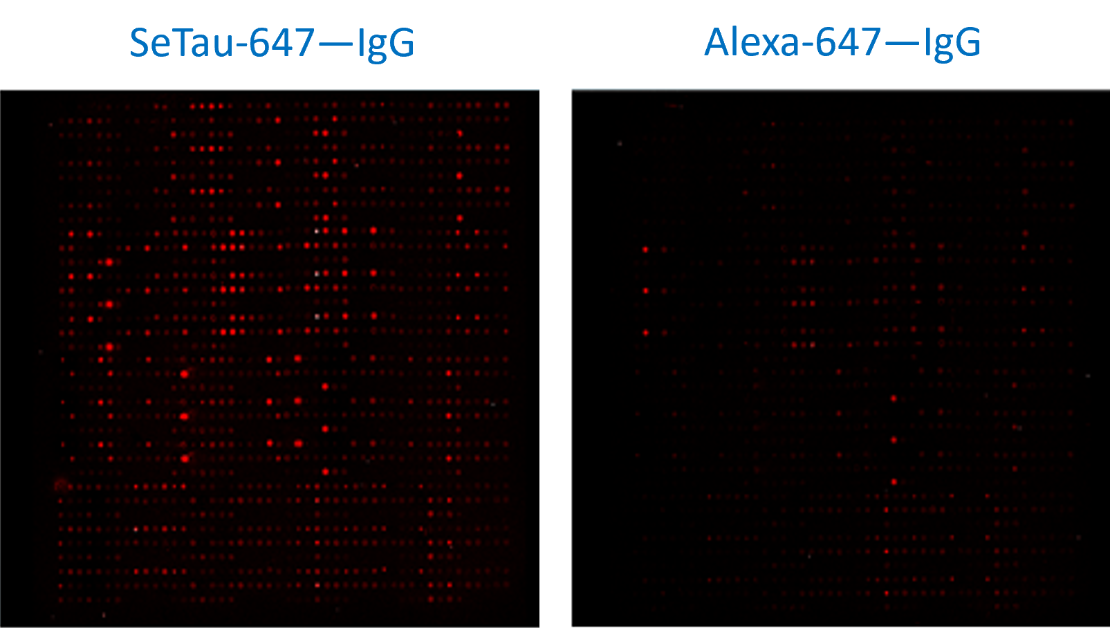 Above is a comparison of our Seta-555 and SeTau-647 dyes with other dyes commonly used in these microarrays. The dyes were diluted 4x starting from 100 ug/ml, 10 spots. The data shows a much higher fluorescence signal coming from the Seta-555 and SeTau-647 dyes, and there was also no detectable channel-to-channel crosstalk (data not shown). These dyes are ideal for both one- and two-color microarray measurements and have much higher ozone stability compared to the dyes of our competitors. Try and experience the difference yourself!
