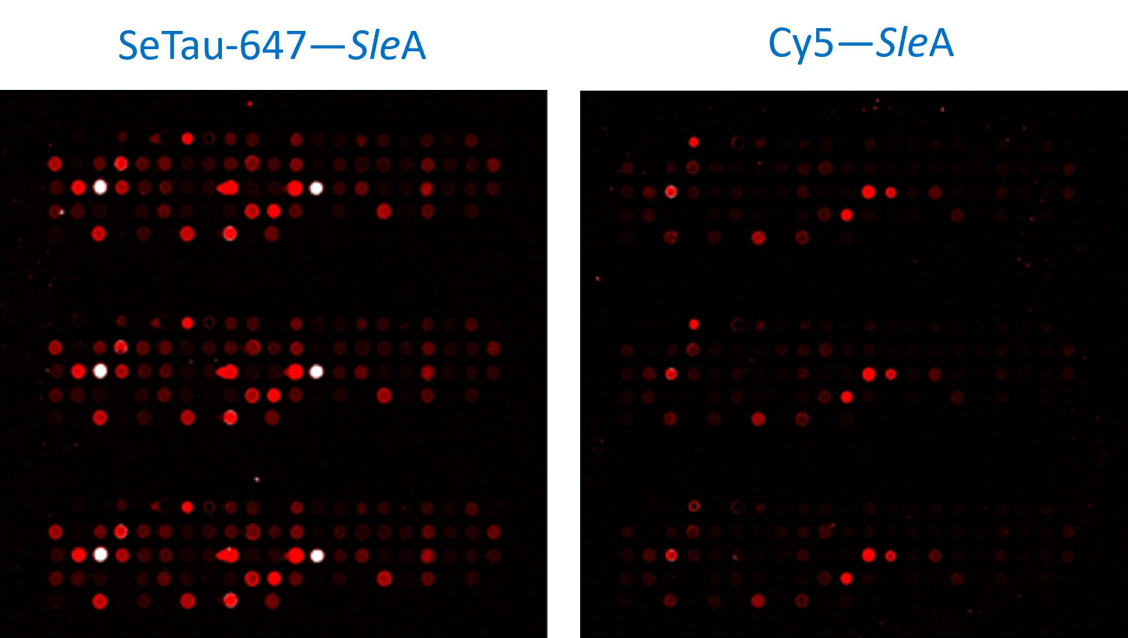 Seta-555-NHS (K8-3335) and SeTau-647-NHS (K9-4149) are amine-reactive dyes specifically developed for a wide range of DNA and protein microarray applications for the Cy3 and Cy5 channels. These reactive dyes are ideal for labeling of oligonucleotides, amino-modified cDNA, antibodies, peptides, and other types of biomolecules for microarray imaging applications.