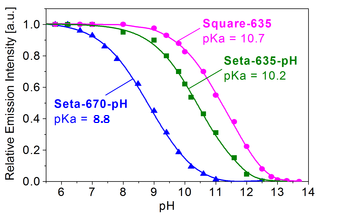 pH-probes with alkaline pKa's: The pH-sensitive dyes with pKa's in the alkaline pH range (see table below) are available in probe and reactive formats. Their pKa's range from 8.8 to 10.7.