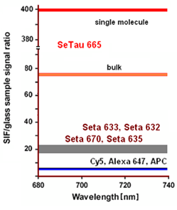 SIF-coated vs. non-coated glass fluorescence signal ratio at various wavelengths tested in a model immunoassay for SeTau dyes (SE ~ 70 times in bulk and SE ~ 400 times in single molecule measurements), Seta-670-NHS, Seta-633-NHS or Seta-632-NHS (SE ~ 15 – 20 times) vs. Cy5, Alexa 647 or APC (SE ~ 6 - 7 times).