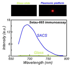 Metal-enhanced fluorescence (MEF) is an important approach to increase the sensitivity thereby decreasing the detection limit of biomedical assays. There are two contributions to MEF. Firstly, under the influence of the incident light, the molecule goes to the excited state and interacts with the metal. Secondly, metal particles accelerate the fluorophore’s radiative decay rate and as a result enhance the emission. This emitter-antenna-like effect results in an increase of the quantum yield of the molecule and in a decrease of its lifetime. A simultaneous increase of the quantum yield and decrease of the lifetime is only possible when the radiative rate increases. Therefore this effect is also known as radiative decay engineering (RDE). While typical enhancement levels for conventional dyes on plasmonic platforms are in the order of 5-7-fold, SeTau-665 shows a 70-fold enhancement in ensemble measurements (Figure) and up to 400-fold in certain ‘hot spots’ in single molecule measurements [16]. Such enhancement levels have not been observed with any other type of dyes.