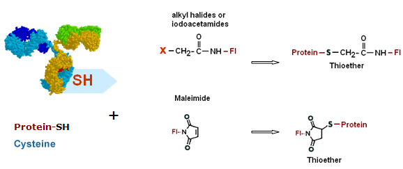Maleimides are the preferred functionality for labeling of small molecules such as peptide and oligo-nucleotides. Maleimides form bonds with thiols at relatively mild conditions and with reasonable yields. Maleimides are less susceptible to hydrolysis in comparison with NHS esters.