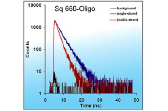 Importantly, Square dyes exhibit a large increase in quantum yields and lifetime upon binding to oligonucleotides. Square-660 was also successfully labeled to a single-stranded oligonucleotide, and the hybridization with the complementary nucleotide led to a change in its fluorescence lifetime from 3 ns to 1.8 ns that could be easily measured with the lifetime-based micro-plate reader from TECAN (see below).
